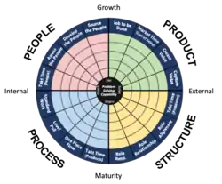 The system integrates the four organizational components of Product, Structure, Process and People. In addition, the system is based on the 4 capabilities of rapid problem solving underlying the Toyota Production System:[1]