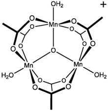 Although no true manganese(III) acetate is known, salts of basic manganese(III) acetate are well characterized. Basic manganese acetate adopts the structure reminiscent of those of basic chromium acetate and basic iron acetate. The formula is [Mn3O(O2CCH3)6Ln]X where L is a ligand and X is an anion. The coordination polymer [Mn3O(O2CCH3)6]O2CCH3.HO2CCH3 has been crystallized.[2]