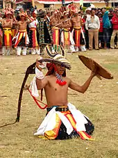 Manggarai people also have a traditional folk sport and war dance called caci, a form of whip fighting where fighting and parrying each other using a whip and a shield is usually performed by two young men in a large field. Caci performance usually begins with danding dance performances, before the caci warriors display their abilities to hit and parry in the competition. The dance is commonly referred to as Tandak Manggarai, a dance performed on stage to predict the outcome of the caci competition.[14]