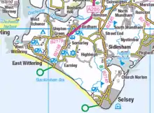 - Mee. History of Selsey. pp.3–4.The (boundary) ran from the entrance of Selsey Harbour (now called Pagham Harbour), round the coast to "Hormouth" at the entrance to Chichester Harbour (now West Wittering); then up the estuary to "Brimesdik" (683) or "Bremerdytch"(1525), (the stream dividing Birdham from Appledram); then eastwards to Wayflete, and from thens in circuit into Made-up-lane (now Jury Lane) and so eastward to Dammer-gate; and so along the dytch unto the said Unredisdytch, (now Bremere Rife, which runs south into Selsey Harbour).