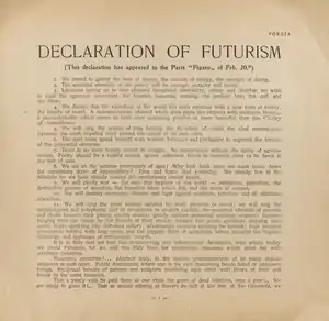 Marinetti wrote the manifesto in the autumn of 1908 and it first appeared as a preface to a volume of his poems, published in Milan in January 1909.[2] It was published in the Italian newspaper Gazzetta dell'Emilia in Bologna on 5 February 1909,[3] then in French as Manifeste du futurisme (Manifesto of Futurism) in the newspaper Le Figaro on 20 February 1909.[4][5][6] Marinetti's Poesia (magazine) focused its April 1909 issue on the manifesto and the Italian and French version were reprinted together with English version.[7]