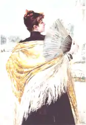 The Manila shawl (Spanish: mantón de Manila or mantón de seda) is an embroidered silk shawl derived from the Filipino pañuelo. They were popular in the Philippines, Latin America and Spain during the colonial era. It also became popular in European fashions in the 19th century. In modern times, it is still an aspect in various traditional clothing in Hispanic cultures, and is particularly prominent as part of the costume (traje de flamenca) of flamenco dancers (bailaoras) and Gitana women.[1]