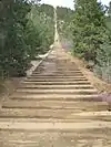 The Manitou Springs Incline, also known as the Manitou Incline or simply the Incline, is a popular hiking trail rising above Manitou Springs, Colorado, near Colorado Springs. The Incline ascends on the east slope of Rocky Mountain which is itself on the eastern flank of Pikes Peak. The trail is the remains of a former 3 ft (914 mm) narrow gauge[1] funicular railway whose tracks washed out during a rock slide in 1990. The Incline is famous for its sweeping views and steep grade, with an average grade of 45% (24°) and as steep as 68% (34°) in places,[2] making it a fitness challenge for locals of the Colorado Springs area. The incline gains 2,011 feet (613 m) of elevation in 0.88 miles (1.42 km) horizontal. Currently the Incline has approximately 2,744 steps[3] from the bottom to the summit, although the top step is numbered "2768". The number of steps changes occasionally with trail maintenance and deterioration.