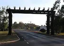 Manjimup was named after the Noongar words "Manjin" (a broad-leafed edible reed) and "up" (meeting place, or place of).[3] Manjimup was first settled by timber cutter Thomas Muir, who took up land near the present town site in 1856. It was declared a town in 1910, and a railway from Perth was completed in 1911.[4]