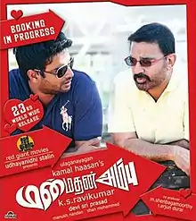 After Unnaipol Oruvan, Kamal Haasan opted against reviving his home production Marmayogi, and signed on for a film produced by Udhayanidhi Stalin. While the film went through months of pre-production, Trisha, in December 2009,[7] and then Madhavan, in February 2010, were added to the project,[8] with K. S. Ravikumar being chosen as the director. Though early indications suggested the film would be titled Yaavarum Kaelir[9] or Karunyam,[10] for which Poetess Vishali Kannadasan, daughter of lyricist Kannadasan was even approached to play a pivotal role.[11] The launch ceremony of the film, held on 3 June 2010, confirmed the title as Manmadan Ambu.[12] During the launch, Kamal Haasan said that prior to the shoot rehearsals were performed.[12] Haasan, along with Crazy Mohan, wrote the film's screenplay and dialogues.[13] The film also marked the debut of cinematographer Manush Nandan in Tamil cinema.[14]