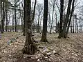 There are around 160 burials, most in unmarked graves. The oldest marked grave is that of Esther Mann (1737–1770),[2] who preceded her husband, John, in death by 34 years.[3] Dozens of blue plastic markers denote what are believed to be burials.[1] The Mann family plot is surrounded by barbed wire, outside of which members of at least ten other families are buried.[1]