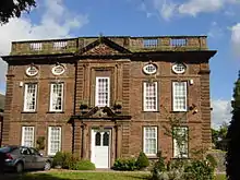The manor house is built in brown brick with red sandstone dressings. The façade is symmetrical with two-and-a-half storeys and five bays. Both lateral bays and the central bay are flanked by rusticated Doric pilasters. The central bay contains a door with Corinthian columns on each side. Above the door is a scrolled pediment containing the arms of Rev Langford. The upper storey of the central bay contains a sash window on each side of which are Corinthian pilasters on large brackets. Above the window is another pediment containing carving. The other bays each contain a sash window in both storeys while the top half-storey contains four blind oval windows; all these windows are in moulded stone frames. Across the top of the façade is a cornice and a balustraded parapet. Behind the façade the house is two-gabled, the north gable being higher than the south.[1][2]