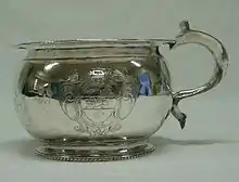 The Mansion House holds one of the largest civic silver collections in England. These collections have been displayed in a new Silver Gallery enabling visitors to view the collections since January 2017. Two of the earliest pieces are a seventeenth century silver chamber pot and gold cup which were bought for the City of York with monies bequeathed by Marmaduke Rawdon in 1669.[6] Marmaduke left "one drinking cup of pure gold of the vallew of one hundred pounds, which I desire my executor to have handsomely made, and the cittie arms and my arms graven upon it, "This is the guift of Marmaduke Rawdon, son of Laurence Rawdon, late of this cittie alderman"; alsoe, I give unto the said cittie a silver chamber pott of the value of ten pounds, booth are to goe from Lord Maior to lord Maior, and if these two bee converted to any other use the vallew thereof to return to my executor or his heirs".[7]