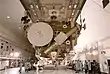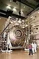 At the SSPF, ISS modules, trusses and solar arrays are prepped and made ready for launch. In this iconic building are two large 100,000 class clean work environment areas.[27] Workers and engineers wear full non-contaminant clothing while working. Modules receive cleaning and polishing, and some areas are temporarily disassembled for the installation of cables, electrical systems and plumbing. Steel truss parts and module panels are assembled together with screws, bolts and connectors, some with insulation. In another area, shipments of spare materials are available for installation. International Standard Payload Rack frames are assembled and welded together, allowing the installation of instruments, machines and science experiment boxes to be fitted. Once racks are fully assembled, they are hoisted by a special manually operated robotic crane and carefully maneuvered into place inside the space station modules. Each rack weighs from 700 to 1,100 kg, and connect inside the module on special mounts with screws and latches.[28]
