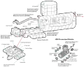 Engineering diagrams of various elements of the ISS, with annotations of various parts and systems on each module.