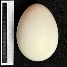 The single white egg averages 61 mm × 42 mm (2+12 in × 1+34 in) and weighs 57 g (2 oz), of which 7% is shell.[30]