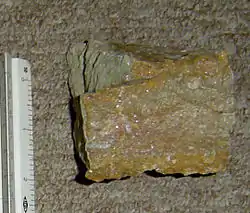 In Illinois, the basal formation is called the Scales Formation and consists mainly of dark brown and gray dolomitic shale. In north central Illinois, the bottom half is dominantly a yellowish gray coarse crystalline dolomite (rock form of the mineral dolomite which is related to calcite). It does not contain many fossils, although large trilobites and large cephalopods are known from Elmer-Lason Quarry. It is typically 75 to 100 feet thick. It is the only formation of the Maquoketa Group that is not exposed in northeastern Illinois.