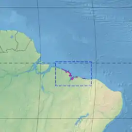 The ecoregion covers and area of 11,300 square kilometers (4,400 sq mi) on the Atlantic coast of Maranhão state.[1] The ecoregion is part of the 31,855 square kilometres (12,299 sq mi) Guianan-Amazon Mangroves global ecoregion, which also contains the Guianan mangroves, Amapá mangroves and Pará mangroves ecoregions.[2] The land is flat and tides may be as high as 8 metres (26 ft) in same places, so salt water may reach inland along the many estuaries and rivers for as far as 40 kilometres (25 mi).[1]