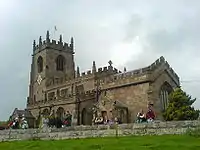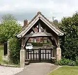 The sandstone churchyard wall dates from the 16th or 17th century and is listed at grade II.[70] Also listed at grade II is the lychgate on Church Lane, which dates from around 1919 and commemorates those who died in the First World War.[71] The rear is inscribed: