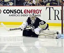 Fleury immediately made his NHL debut in 2003–04 as the youngest goaltender in the league at 18 years old (three years younger than the second-youngest, Rick DiPietro of the New York Islanders).[6] He appeared in his first NHL game on October 10, 2003, against the Los Angeles Kings, recording an impressive 46-save performance, which included a penalty shot save, in a 3–0 loss.[7] Fleury recorded his first NHL win in his very next start, on October 18, with 31 saves in a 4–3 win over the Detroit Red Wings.[8] His first NHL shutout came on October 30, in a 1–0 victory over the Chicago Blackhawks.[8] Fleury shared time with goaltenders Jean-Sébastien Aubin and Sébastien Caron[9] and lived up to first-overall-pick expectations early, earning Rookie of the Month honours in October with a 2–2–2 record, 1.96 goals against average (GAA) and .943 save percentage.[6] As the season progressed, however, his performance began to sink, mainly due to Pittsburgh's poor defence.[8][9] The team regularly gave up over 30 shots per game, and rarely managed to become an offensive threat.[10] He was loaned to Team Canada for the 2004 World Junior Championships in December and, upon returning with a second consecutive silver medal, he was sent back to the QMJHL on January 29, 2004.[9] In light of financial difficulties for the franchise, it is believed Fleury's $3 million contract bonus, which he would have potentially received if he stayed and met several performance goals, was a factor in the decision to return him to Cape Breton.[9] To no avail, Fleury offered to forfeit his bonus to remain with the club.[11] Fleury finished the QMJHL season with Cape Breton in a first round elimination and was subsequently assigned to Pittsburgh's American Hockey League (AHL) affiliate, the Wilkes-Barre/Scranton Penguins, and appeared in two post-season games.