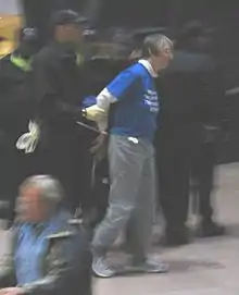 United for Peace and Justice (UFPJ), a coalition of more than 1,300 international and U.S.-based organizations opposed to what they describe as "our government's policy of permanent warfare and empire-building" organized the March 19 actions.[3][18][19] The events – involving up to 1000 people – took place throughout the downtown with protesters marching on 12th street to the Internal Revenue Service (IRS) building on Constitution Avenue declaring that they do not want any more tax money being used to wage war.[1][3][8] Led, in part, by the War Resisters League and Code Pink, 31 people were arrested for crossing police lines at the IRS and blocking three entrances.[3][8][10] Demonstrators also gathered in front of institutions which profit from the war, such as the American Petroleum Institute – where they staged a sit-in blocking traffic – and at military recruitment offices.[1][3][8][20][21] The protesters, including war veterans, demanded the arrests of President George W. Bush, Vice President Dick Cheney and Secretary of State Condoleezza Rice as war criminals.[8] Students for a Democratic Society protesters marched up and down K Street as part of their "Funk the War" protest to "put on the map all the people who profited from the war".[10] Other protesters hurled balloons full of red paint at a military recruiting station and smeared it on buildings of defense contractors Bechtel and Lockheed Martin.[8] Many protesters marched to beating drums, and chanted, "No blood for oil!"[1] Traffic in many areas was disrupted,[1] and interruptions at the IRS were evident as workers inside were seen peering out windows at the protesters. At least thirty demonstrators were arrested around the IRS headquarters for crossing a police barricade.[22] Two blocks from the Whitehouse, in McPherson Square, over two hundred protesters declared victory in shutting down traffic with some engaging the police while others chained their hands together inside school desks while demanding cuts in war spending and more money for education.[8] According to a Congressional Budget Office (CBO) report published in October 2007, the U.S. war in Iraq could cost taxpayers $1.9 trillion by 2017 when counting the huge interest costs because combat is being financed with borrowed money.[23]