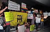 In one of his published books, Feliciano wrote on homosexuals "The rotten feelings of homosexuality leads to hatred, crime, and rejection. We love homosexuals, but we abhor their promiscuous practices." His statements were supported by then fellow federal deputy Jair Bolsonaro.[14] Feliciano was investigated for hate speech for that comment, but was eventually cleared of any wrongdoing. In the closing statements the court said that Feliciano's comments were clearly homophobic and reprehensible, but as no law existed at the time to prosecute homophobia in Brazil, Feliciano could not be formally charged.[15] In August 2013 there was controversy again as there were reports of LGBTQ activists being attacked after a campaign rally by Feliciano in Pará.[16] In an interview for an upcoming book titled Religiões e política; uma análise da atuação dos parlamentares evangélicos sobre direitos das mulheres e LGBTs no Brasil Feliciano claimed that giving women more rights would undermine relationships and marriage, as well as increasing the likelihood that their children would be gay.[17]