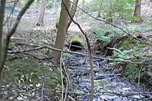The main source of the Mardyke is in Holden's Wood between Great Warley and Little Warley.[1] It flows roughly 11 miles (18 km) from the source to the Tideway of the Thames at Purfleet, close to the Queen Elizabeth II Bridge. There are two tributaries flowing south from Thorndon Country Park, in the grounds of Thorndon Hall. One of these flows south from Old Hall Pond. The pond has a sluice gate that could be opened to allow the water to flow over an artificial waterfall – the sort of water feature popular with landscape gardeners such as Lancelot "Capability" Brown who landscaped the grounds of Thorndon Hall in the 18th century, although the pond itself dates from the 13th century.[2] Another tributary flows west from Dunton Plotlands section of the Langdon Nature Reserve in Langdon Hills and another flows east from Upminster.