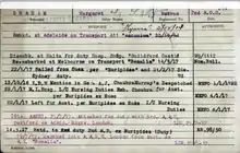 - An alternative history can be found in the biography of Nurse Frances Mary Deere, who enlisted 25 November 1914, travelled by train from Adelaide to Melbourne, joining the medical unit ship HMAT Kyarra (transport A55), which departed Melbourne on 5 December 1914 under a news blackout.[20] Among the 20 nursing volunteers from Adelaide was Matron Margaret Graham.[21] This accords with the handwritten correction on the record card pictured here and by Merrilyn Lincoln's assertion in the Australian Dictionary of Biography that Graham "embarked at Melbourne in December".[9]