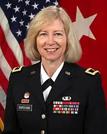 Burcham has been chief of the Joint Capabilities Division of the Resources, Assessments and Force Management Directorate at the Pentagon and commander of the USACE North Engineer District in Iraq and the Europe Engineer District. She was appointed commander of the USACE Great Lakes and Ohio River Division in September 2011, the first woman to command a USACE division.[3] In this role, Burcham commanded 4,800 personnel in seven engineering districts covering 17 states and including the waters within the Great Lakes and Ohio River basins.[1] Her annual budget was $2 billion and the division's responsibilities included the maintenance of navigational aids, flood defense projects, water conservation schemes, hydro-electric power and environmental restoration projects of an asset value of over $80 billion.[4] She was promoted to brigadier general on January 27, 2012 at the USACE headquarters in Washington and became the first female general of the USACE.[1] She was appointed to the Mississippi River Commission on May 28, 2013 by President Barack Obama.[5]