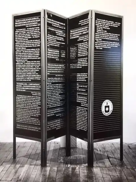 "CIA Screen" (1987-1988). Multi-media four-panel folding screen. Enlarged negative photostats on transparent film of facsimile of a 4-page recruitment brochure published by the Central Intelligence Agency (CIA) for its Clandestine Service. Teak frames with Plexiglas, 72" x 80" (4 panels). In the exhibition "Democracy and Politics," (1988) curated by Group Material at the Dia Art Foundation, New York.[21][22] Photograph by the Margia Kramer.