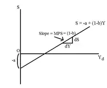 Marginal propensity to save is also used as an alternative term for slope of saving line. The slope of a saving line is given by the equation S = -a + (1-b)Y,[8][9] where -a refers to autonomous savings and (1-b) refers to marginal propensity to save (here b refers to marginal propensity to consume but as MPC + MPS = 1, so (1-b) refers to MPS).