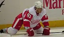 Despite a reported five-year contract offer worth $7 million annually from the Penguins in attempts to retain his services, on 1 July 2008, Hossa signed a one-year deal with the Detroit Red Wings worth $7.45 million. Hossa had also reportedly turned down a multi-year offer from the Edmonton Oilers worth at least $9 million per season.[17] Hossa explained that he opted for the shorter-term contract in hopes of a better opportunity to win a Stanley Cup with the Red Wings.[18] With Red Wings' veteran forward Kirk Maltby already wearing Hossa's number 18, Hossa switched to 81 with Detroit.[19] Hossa notched his first goal as a Red Wing on 18 October, an overtime winner against the New York Rangers, which also marked the 300th goal of his career.[20] Hossa scored a goal in his return to Pittsburgh with the Red Wings on 8 February, where he was heavily booed by the Pittsburgh fans.