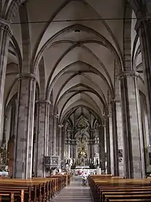 The parish church has received numerous donations from the citizens of the city and, therefore, belongs to the churches of the Alps with the most pews. In addition to the bell tower and the pulpit, there are two organs in the parish church, a pietà from the time of International Gothic as well as various late Gothic frescoes and neo-Gothic side altars that survived the destruction in World War II. The Gothic nave was built in 1716 by the Veronese architect Raghieri and contrasts with the monumental Baroque high altar with its numerous columns and figures of saints.[14]