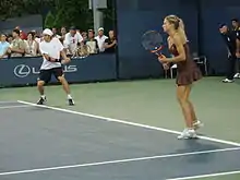 Kirilenko started her preparation for the US Open at the Western & Southern Open in Cincinnati. Seeded twelfth, she lost in the first round to Venus Williams.[24] She bounced back into form at the Premier level New Haven Open at Yale. Seeded seventh, Kirilenko reached her second final of the year where she was defeated by second seed Petra Kvitová.[25] Seeded fourteenth at the US Open, Kirilenko suffered a third-round upset at the hands of Andrea Hlaváčková.[26] In doubles, Kirilenko and Petrova upset the Williams sisters in the third round[27] before losing in the quarterfinal to eighth seeds Nuria Llagostera Vives/María José Martínez Sánchez.