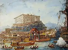 On 13 August 1817, Maria Leopoldina was finally allowed to embark on her journey from Livorno, Italy, on the Portuguese fleet composed of the ships D. João VI and São Sebastião. With her luggage and a large entourage, she faced 86 days of crossing the waters of the Atlantic. Forty boxes the height of a man contained her trousseau, books, collections and gifts for the future family. She brought also an impressive household: court ladies, a chambermaid, a butler, six ladies-in-waiting, four pages, six Hungarian nobles, six Austrian guards, six chamberlains, a chief Almoner, a chaplain, a private secretary, a doctor, a performer, a mineralogist and her painting teacher.[34] The Archduchess definitively parted for Brazil two days later, on 15 August. The differences in habits and customs, already noticed in the period since she embarked, foreshadowed the difficulties that she would face in Rio de Janeiro. The first time she set foot on Portuguese territory, however, it was not on Brazilian land, but on Madeira Island, on 11 September.[35][36][37]