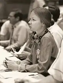 Flight Activities Officer Marianne J. Dyson, a member of the STS-4 Entry Team, on console in Mission Control at Johnson Space Center.