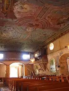 Connected to the choir loft was a small area where a large organ with metal pipes could be seen. The organ, which still needed restoration at the time of the earthquake, was last played in 1975.[15] Estimated to have been built by Spanish pipe organ makers between the 17th and 19th centuries, the Maribojoc organ was one of the remaining 14 Spanish era pipe organs, three of which were in Bohol.[16] Also located in the choir loft was a lectern for choral books. On the ceiling, a mural of the sacrament of baptism depicted Father Quiterio Sarigumba as the officiating priest.[11] Father Sarigumba, also known as the "builder priest", was known for having repaired portions of Jagna Church and the addition of new facades to the churches of Inabanga and Panglao. A passage to the belfry was located in the choir loft.[3]