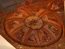 The interior exhibited a contrast of bare nave walls against the paintings drawn on the metal ceilings leading to the main altar and retablo mayor. The ceiling paintings were known to be works of Raymundo Francia, as shown by his signature on one corner of the dome in the 1930s.[11] An acknowledgment on the initiative of the San Tarcisio Martir Maribojoc Catholic Association 'Comité de Obras' could also be seen painted before the crossing.[11] Several paintings by Francia on metal had deteriorated even before the total destruction of the church by earthquake in 2013. The Francia paintings were never touched up nor repainted.[12] The new church dome (or cimborrio) was constructed in June 1889. Ray Francia was again commissioned to do mural works on the cimborrio by painting the Epistles of The Four Apostles, namely the saints John, Matthew, Luke and Mark.[13]