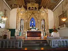 Maribojoc had five intricately carved Neo-Gothic retablos in the sanctuary and transepts.[14] Striking features of the retablo were the presence of arches, crockets, Mudéjar stars and the profusion of carving. The whole retablo was probably completed on January 7, 1934 as a project of the Comité de Obras during the term of Father Quiterio Sarigumba (P.Q.S.) as seen on the inscription in the upper reaches of the central retablo.[11] An older retablo, built from 1616 to 1692, predated the church.[5]