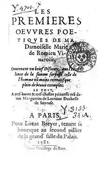 The first work signed by “Marie de Romieu” surfaced in Paris in 1581, titled Les Premières Oeuvres Poétiques de ma Damoiselle Marie de Romieu Vivaroise.[7] A sort of anthology of verse, it contained occasional brief pieces flattering some authority figures in Viviers.[8] Premières Oeuvres features de Romieu's discourse on the superiority of women as its opening piece. The entirety of the work was made up of a mixture of styles common to the Renaissance which included elegies, eclogues, odes, sonnets and hymns.[9]