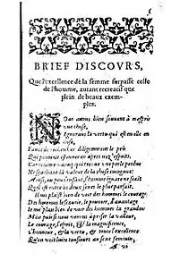 Marie de Romieu's discourse is closely based on part of a 1554 work by Charles Estienne, titled Paradoxes, which are notions contrary to the common opinion. Estienne's work, in turn, was itself based on Paradoxes, a work by Italian humanist author Ortensio Lando. Lando's piece was mainly a list of “exemplary ladies”, while Estienne builds onto that by omitting some Italian names and adding some French ladies to it.[2] De Romieu, however, took it further. She follows Estienne's prose, adding women she thought were deserving of praise. She paid special attention to the role of educated women, especially her contemporary female poets, praising in her Discourse other French female writers, such as Catherine de Clermont, Marguerite de Navarre, and Madeleine and Catherine des Roches.[3] Notably, she removed the names of women who were entirely devoted to serving their husbands, as well as women who attempted to hide their accomplishments from public view.[2]