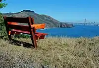 Where Conzelman Road runs along the southern shore of the Headlands and becomes one-way, a pedestrian path leads upwards to Hawk Hill. A short distance further on the right, in a grove of Monterey pines, is a bench from which it is possible to view the Golden Gate, ship traffic beneath the bridge, and the city just beyond.