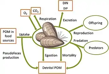 Changes in benthic biota have far-reaching impacts on biogeochemical cycles in the coastal zone and beyond. In the illuminated zone, benthic microphytes and macrophytes mediate biogeochemical fluxes through primary production, nutrient storage and sediment stabilization and act as a habitat and food source for a variety of animals, as shown in the diagram on the left above. Benthic animals contribute to biogeochemical transformations and fluxes between water and sediments both directly through their metabolism and indirectly by physically reworking the sediments and their porewaters and stimulating bacterial processes. Grazing on pelagic organic matter and biodeposition of feces and pseudofeces by suspension-feeding fauna increases organic matter sedimentation rates.[181][182] In addition, nutrients and carbon are retained in biomass and transformed from organic to inorganic forms through metabolic processes.[183][180][184] Bioturbation, including sediment reworking and burrow ventilation activities (bioirrigation), redistributes particles and solutes within the sediment and enhances sediment-water fluxes of solutes.[185][186] Bioturbation can also enhance resuspension of particles, a phenomenon termed "bioresuspension".[187] Together, all these processes affect physical and chemical conditions at the sediment-water interface,[188] and strongly influence organic matter degradation.[189] When up-scaled to the ecosystem level, such modified conditions can significantly alter the functioning of coastal ecosystems and ultimately, the role of the coastal zone in filtering and transforming nutrients and carbon.[1]