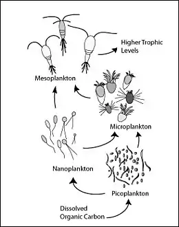 Microscopic life undersea is diverse and still poorly understood, such as for the role of viruses in marine ecosystems.[89] Most marine viruses are bacteriophages, which are harmless to plants and animals, but are essential to the regulation of saltwater and freshwater ecosystems.[90]: 5 They infect and destroy bacteria in aquatic microbial communities, and are the most important mechanism of recycling carbon in the marine environment. The organic molecules released from the dead bacterial cells stimulate fresh bacterial and algal growth.[90]: 593 Viral activity may also contribute to the biological pump, the process whereby carbon is sequestered in the deep ocean.[91]