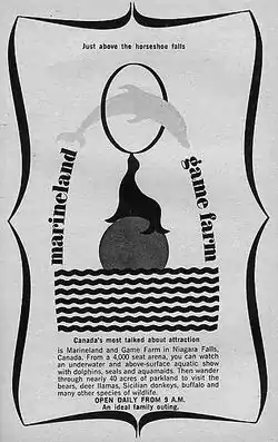 In 1964, Holer added two dolphins, along with a few other animals and the attraction became known as "Marineland And Game Farm".[33] By 1966, a 2,000-seat "aquatheatre" was completed along with a "grotto" of aquariums and shops.[33] The grotto in the new Aquarium Dome contained eight tanks used to display fresh-water fish.[36] The park became a popular family attraction and recorded an annual attendance of 250,000 for the 1967 season.[37] In 1968, the park added alligators.[36] Neighbouring attraction "Niagara Falls Indian Village" closed down after the 1968 season and Marineland purchased their property.[38]