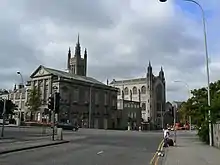 Amongst the buildings demolished to make way for the new frontage of Marischal College at the turn of the 20th century, was the Greyfriars collegiate church, built in 1532 and incorporated as part of the College in 1593. Following a dispute regarding the conservation of this church, a new church building was constructed within the Marischal College complex. It is incorporated into the College frontage, which includes the southern tower, notable for being surmounted with a spire.[17]