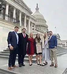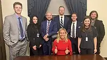 Prominent Republicans who supported Greene in her candidacy included Donald Trump; U.S. representatives Jim Jordan, Andy Biggs, and Matt Gaetz; Turning Point USA founder Charlie Kirk; and Trump's chief of staff Mark Meadows.[96][97][98][84][99] Meadows's wife, Debbie Meadows, is the executive director of RightWomen Pac, which endorsed Greene and contributed $17,500 to her runoff campaign. Other donors included Barb Van Andel-Gaby – the chair of board of the Heritage Foundation – and attorney L. Lin Wood, who later promoted conspiracy theories about the 2020 presidential election.[100] Greene also received support from the House Freedom Fund, a political action committee and the campaign fundraising arm of the House Freedom Caucus.[97][101] The Georgia Republican Party contributed $5,220 to her campaign treasury on March 2, 2020.[102]