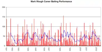 In the first tour match against Jamaica, Waugh was felled by a bouncer from Courtney Walsh, but recovered to score a century despite the presence of his teammate's spilt blood on the pitch.[93] Waugh scored 67 from 66 balls in the first ODI at Sabina Park in Kingston as Australia took a 1–0 lead. The ODI series was interrupted by the first Test, also at Sabina Park. Waugh scored 39 in a rain-affected draw, later admitting to having felt out of his depth against the hostile fast bowling—blood was spilt on both sides.[94] The ODI series resumed and after consecutive matches without passing 20, Waugh played a large part in victory in the fourth match that gave Australia the series win. He scored 49 from only 37 balls and then took 3/34 to seal a 37-run win.[93] He ended the series with 156 runs at 31.20 and eight wickets at 18.25.[95] The Test series resumed and Waugh scored 71 in the second Test as Australia lost by ten wickets.[90]