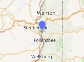 The Market Street Bridge is a suspension bridge connecting Market Street in Steubenville, Ohio and West Virginia Route 2 in Follansbee, West Virginia over the Ohio River. As a project of the Steubenville Bridge Company, it was constructed in 1905 by the Ohio Steel Erection Company, the framework was created by the Penn Bridge Company, and the original steel was done by Jones and Laughlin Steel Company and Bethlehem Steel. The bridge spans a length of 1,794 feet (547 m) with a width of 20.7 feet (6.3 m). As of 2002, the average daily traffic was estimated around 15,000 vehicles.[2] It was listed on the National Register of Historic Places in 2019.