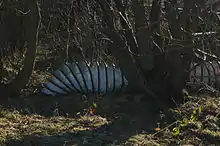 After closure, the headgears and other machinery at Marley Hill Colliery were scrapped and the buildings levelled. A hole was knocked into the wall of the square building which enclosed the top of the upcast shaft, and the rubble from the rest of the buildings tipped in to backfill it. This process having been completed, the building was demolished and a large concrete cap placed over the mouth of each shaft. There appear to be only two remaining buildings directly associated with the colliery. One of these is an airlock above a backfilled ventilation shaft from the Clockburn Drift, hidden away in Clockburn Wood near Whickham. The shaft was known as the Hollinside Shaft and actually pre-dates the drift as it was originally part of Axwell Park Colliery,[17] which was situated roughly a mile to the north-east. This colliery closed in 1954 after men from Marley Hill began working its remaining reserves beneath Hollinside and Gibside via the drift, at which point the NCB installed a fan to aid ventilation, these workings being some distance from the Shafts at Marley Hill Colliery itself. The other remaining structure is a curious rendered brick hut with double-walled construction and heavy steel doors, which stands in the middle of a field to the south of St. Cuthbert's Park. It is best to consult Google Earth to pinpoint the location. This is the colliery's former powder magazine, where explosives for use underground were stored. It was presumably constructed sometime in the first couple of years of the 20th century, as the bricks used, which bear the name "Blythe & Sons, Birtley Station" along with the letters ER (Edward VII) and the date 1901, are of the same type (stamped 1903 and 1904) used to construct Church Street, Cuthbert Street and Glamis Terrace. It has evidently been designed to direct the force of any explosion upwards, with its isolated location meaning that the resulting debris would not land on the surrounding houses or colliery buildings. It is (for unknown reasons) sometimes referred to locally as "the butterfly chambers" and fell out of use some time before the colliery closed, with one former Marley Hill miner recalling playing in it as a child. A new explosives store was built to replace it, this building being situated near the pit head baths.