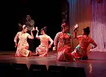 Marmas follow the Burmese calendar. They celebrate the New Year, called Sangrai (သင်္ကြန်), which begins on the first day of Bohag.[8] They make sangraimu, which is a form of traditional cakes. They take part in Sangrain Relong Pwe (သင်္ကြန်ရေလောင်းပွဲ; water pouring), where young Marma men and women spray each other with water. Sangrai is celebrated in three days, On the 1st day, called Painchwai or Akro, homes are decorated with flowers. On the 2nd day, Sangrai Akya, Marmas participate in traditional sports, dances, cultural activities and hold meetings regarding community issues. They also go to monasteries to participate in the Buddha statue's bathing (cleansing) ritual on this day. On the 3rd day, called Sangrai Atada, they cook a vegetable dish made out of more than 100 ingredients, called hangbong (ဟင်းပေါင်း; pachan in Bangla).[9]