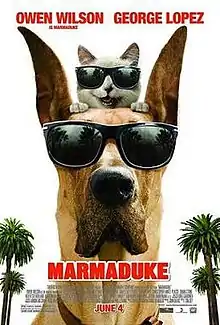 Marmaduke is a 2010 American live action comedy film adaptation of Brad Anderson's comic strip of the same name. The film centers on a rural Kansas family and their pets; a Great Dane named Marmaduke (voiced by Owen Wilson), and his best friend, a Balinese cat named Carlos (voiced by George Lopez); as the family relocates to Orange County, California and has to face the challenges of starting a new life. The film was released on June 4, 2010 and received largely negative reviews from critics.