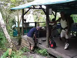 The first section of the path, known as the Mantella Trek, takes visitors just inside the park entrance, and leads to a picnic area after the first 2.5 km (1.6 mi). The first camp, Camp Mantella, is 4.5 km (2.8 mi) further along the path.[45] The camp is in the lowland rain forest above the Manantenina River at an elevation of 450 m (1,480 ft).[36][44] The camp is 800 m (2,600 ft) from the Humbert waterfalls,[44] and offers opportunities to see lemurs, such as the northern bamboo lemur (Hapalemur occidentalis);[45] many species of bird, such as the helmet vanga; as well as a variety of amphibians and reptiles,[44] such as leaf-tailed geckos, leaf chameleons (genus Brookesia), and many types of frogs.[36]