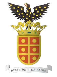 - Crest: an eagle displayed, sable, bezanté, armed and beaked or and langued gules.[29]