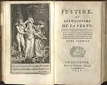 Through the unreleased passions of his libertines, Sade wished to shake the world at its core. With 120 Days, for example, Sade wished to present "the most impure tale that has ever been written since the world exists."[58] Despite his literary attempts at evil, his characters and stories often fell into repetition of sexual acts and philosophical justifications. Simone de Beauvoir and Georges Bataille have argued that the repetitive form of his libertine novels, though hindering the artfulness of his prose, ultimately strengthened his individualist arguments.[59][60] The repetitive and obsessive nature of the account of Justine's abuse and frustration in her strivings to be a good Christian living a virtuous and pure life may on a superficial reading seem tediously excessive. Paradoxically, however, Sade checks the reader's instinct to treat them as laughable cheap pornography and obscenity by knowingly and artfully interweaving the tale of her trials with extended reflections on individual and social morality.